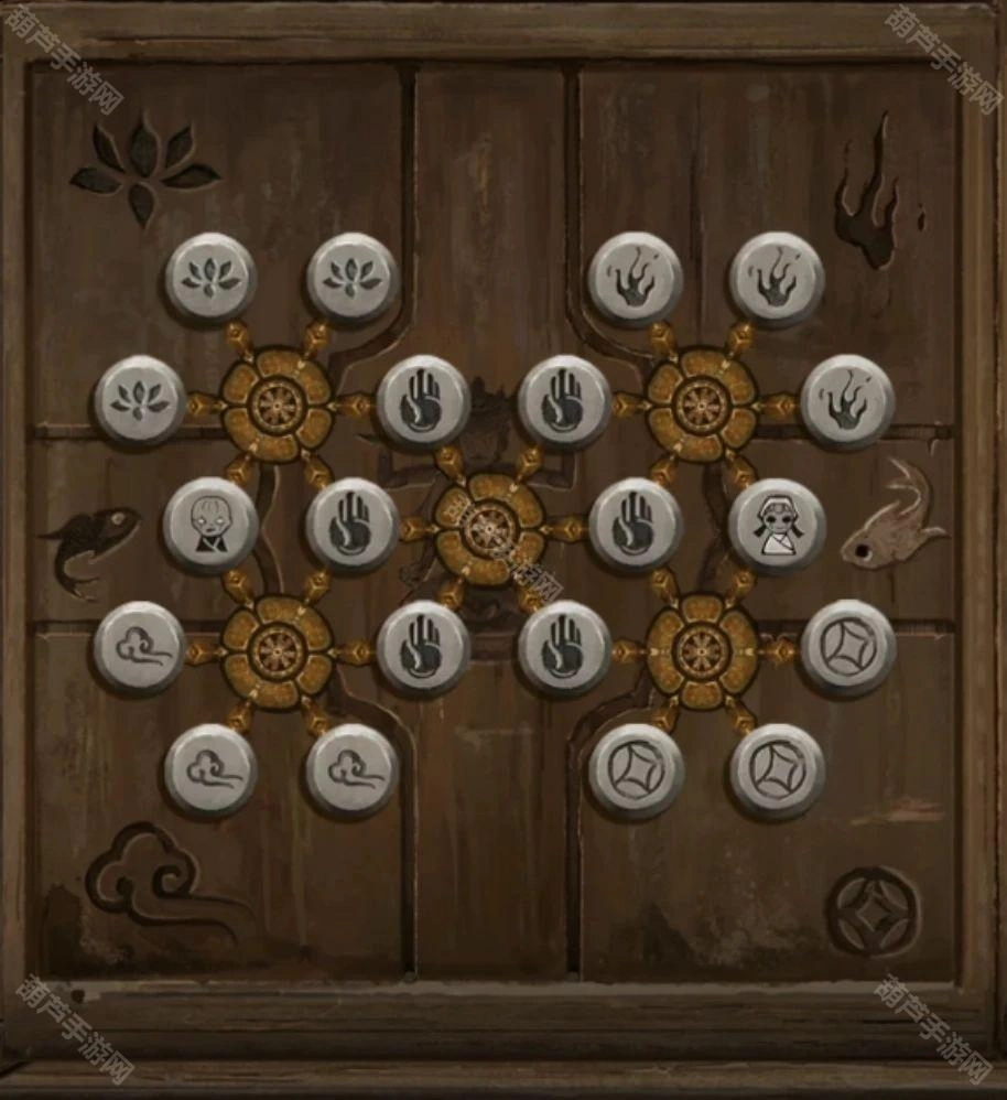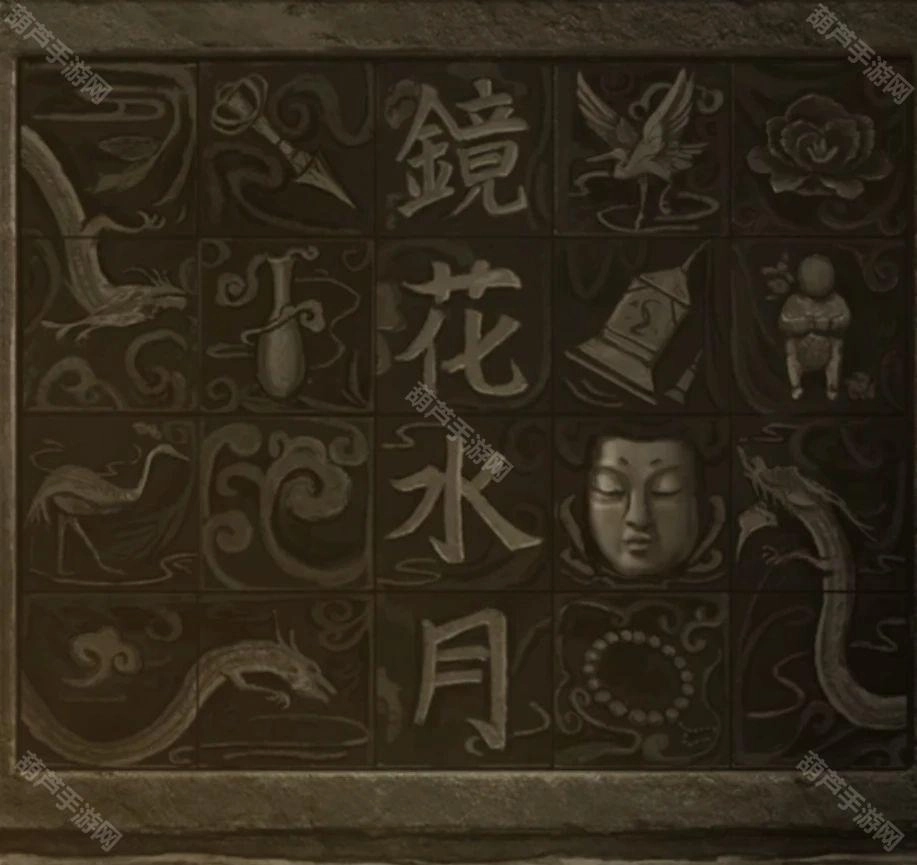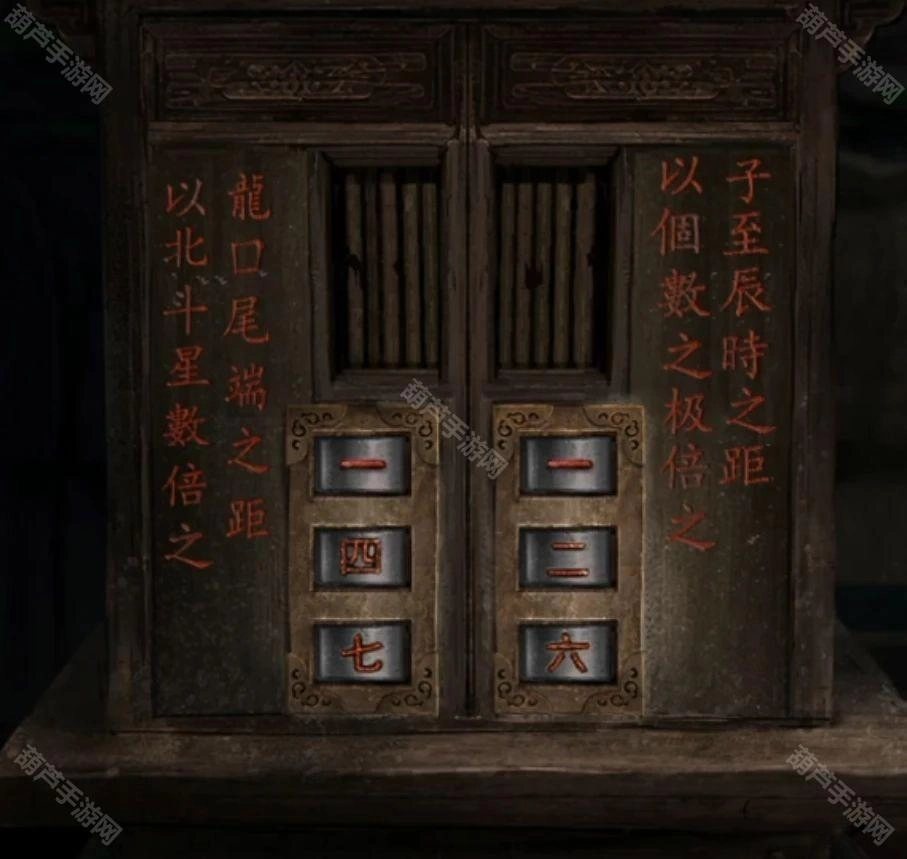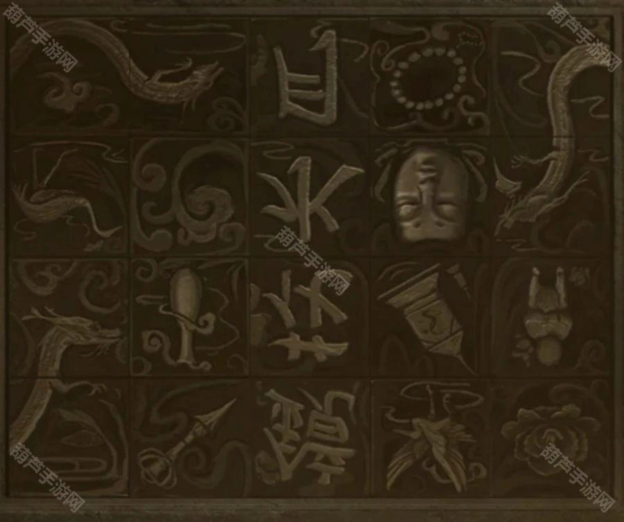 剧情结束后查看一下左上角的柜子,很明显是左上角花、右上角火、左下角云、右下角铜钱,一黑一白对应黑衣白衣两个小孩,调整完毕如上图,打开获得木块、铜镜、女娃娃。查看一下右边的石人脸上画着符咒,出门将铜镜通过水流交给肖医生,切换视角。