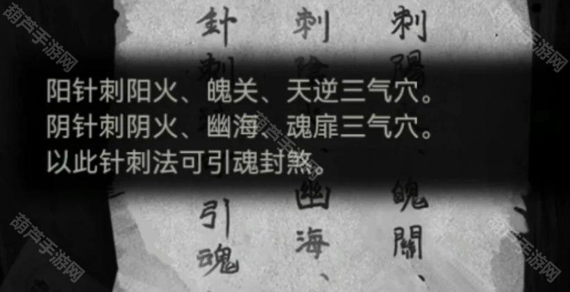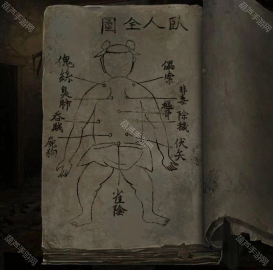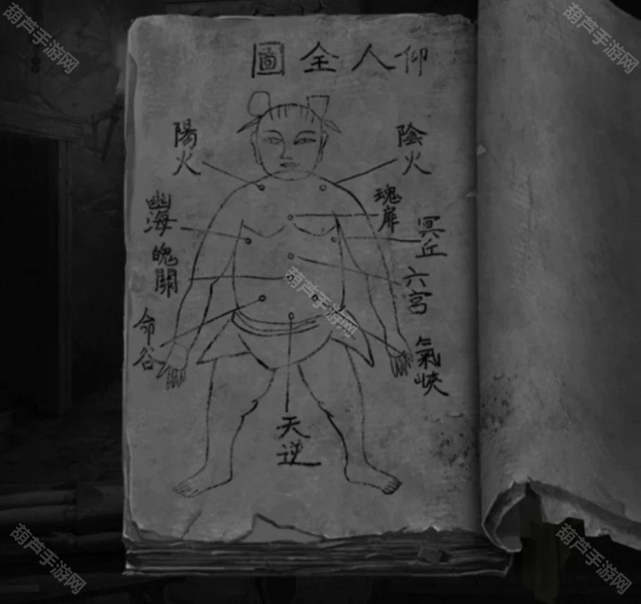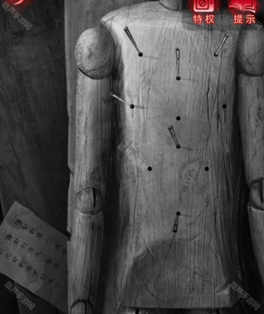 上楼左转发现木偶也变样子了,旁边的纸条变成了阳针刺阳火、魄关、天逆,阴针刺阴火、幽海、魂扉,前面书上说过阳是黑色阴是白色,所以我们还需要找到白色的针,然后黑针插阳火、魄关、天逆,白针插阴火、幽海、魂扉。