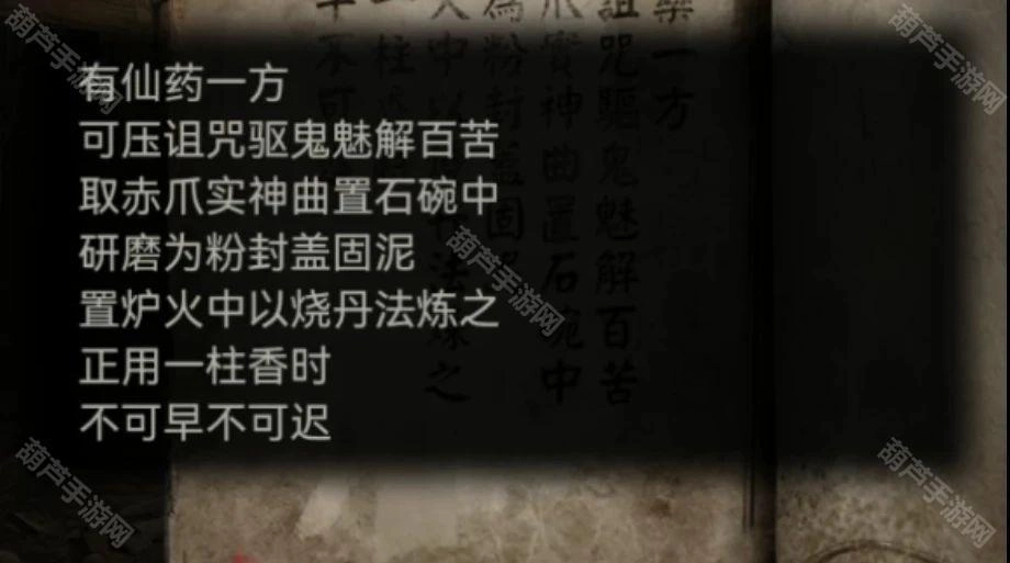 检查壁画下方的箱子时,发现提示显示锁已损坏。法器的说明提到它十分坚固,不如让它来试试看。果然,用法器撬开了箱子,从里面取到了神曲。看来我们的药材已经集齐了!接着查看左边的石台子,就能回到当前的时间节点。之后前往口舌房间,先看一眼后方书上的步骤说明。用火柴点燃左边的炉子,把两种药材放进坩埚,再用小锤子将其磨碎。随后点击左下角的泥巴进行封口,再用中间的坩埚钳夹起坩埚放入炉子,这时会开始一个计时小游戏。在这个游戏里,点击开始后随意点燃一根香,等香快要烧到根部时,点击右下角的“取出”按钮即可。经过实际测试,中间那根香是最容易操作的。取出后,就能得到仙药了。