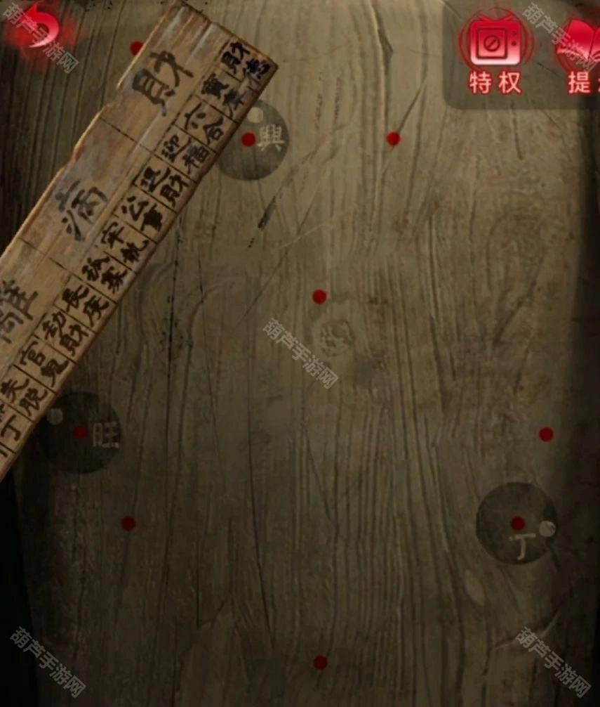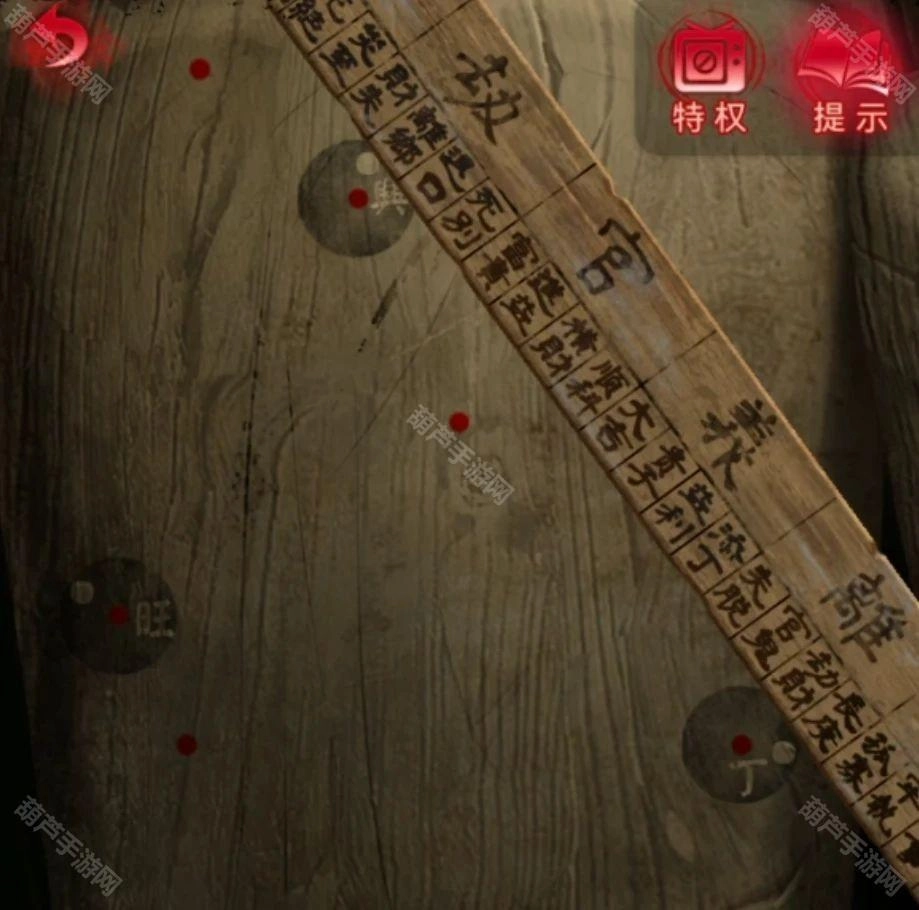 剧情过后再次查看木头人的后背,果然谁拔罐都有个印子!木头人也不例外啊!点击竹罐回收一下,然后拿出尺子开始量,尺子是可以拖动和旋转的,按照我们前面的提示,将尺子的宝库位置放在兴的白点上,那么旺的位置对应的是失脱,将长庚的位置放在丁的白点上,那么兴的位置对应的是梨香,啊不对是离乡,把官鬼的位置放在旺的白点上,那么丁的位置对应的是炎至。