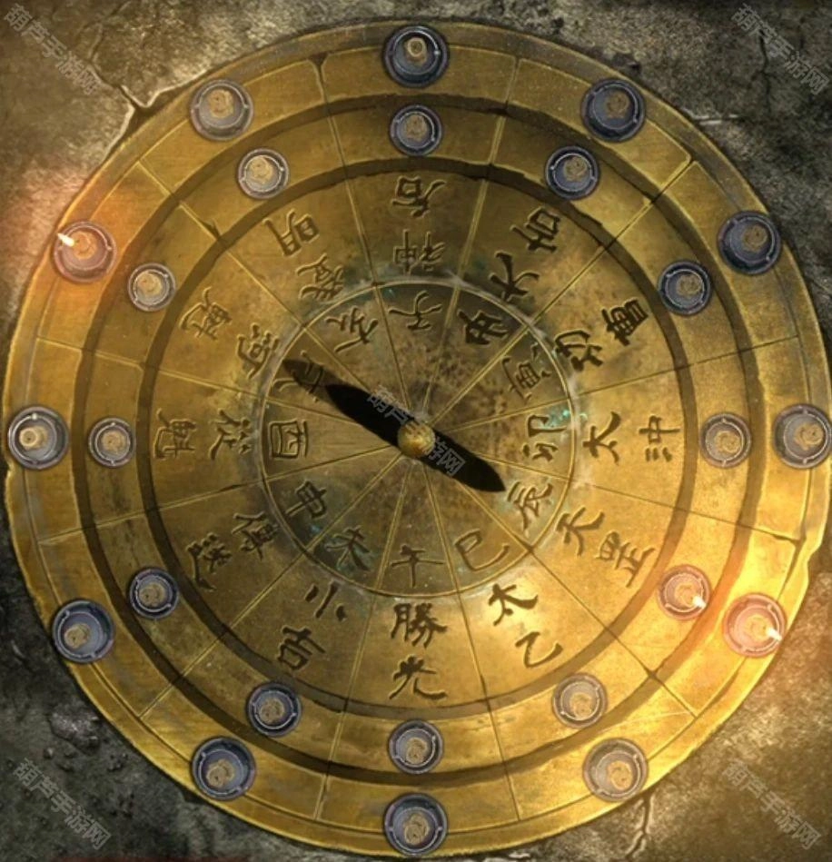 回到龙房间查看左边的石台子,上面就有太冲和戌子这两个要素,台子上的白色圆圈都是蜡烛,用火柴点燃就能将中间柱子的影子投射到对面了,就和日晷差不多嘛,外圈的蜡烛投射的影子短,里圈的蜡烛投射的影子长,所以我们就点燃太冲和戌、子对面的蜡烛让影子刚好投射在这三个位置即可,也就是点亮里圈最左边和外圈最下面和右下角的蜡烛。