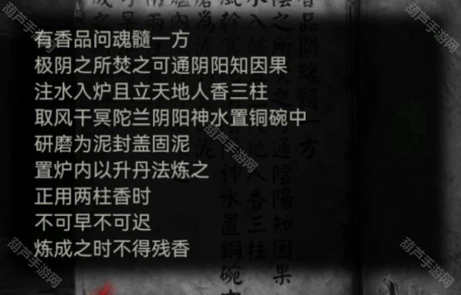 先查看右侧的书籍,找到干冥陀兰的使用方法;接着点击左上角,按步骤操作:先点击左下角的大水缸加水,再往面前的坩埚里放入干冥陀兰花,加入白色的阴阳神水;用小锤子处理后,点击左下角的小罐子涂抹泥巴;然后用火柴点燃后方的火炉,拿起坩埚钳夹住坩埚放进火炉。这里要注意时间需控制在两炷香,且不能有残香,所以操作顺序是:先点燃最左边的香,再随意点一下最右边的香,等最左边的香烧到最底部时点燃中间的香,这样中间的香烧完后取出坩埚,时间刚好是两炷香且无残香。完成这些步骤后,就能拿到熏香了。