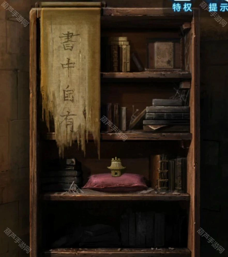 查看一下前面桌子上的书和后面的竹简上线索,阴=丁,葬=丙,寿=戊,塔=乙,灵=甲,这里注意如果看不清或者不认识繁体字直接点击查看是有对应标注的,虽然都是汉字的对应,但是甲乙丙丁我们肯定背过了,那么这甲乙丙丁戊是连续的优先考虑顺序问题,所以密码很可能就是连续的灵塔葬阴寿,这些都是各种童谣,所以对应的应该是左边罐子的密码了。