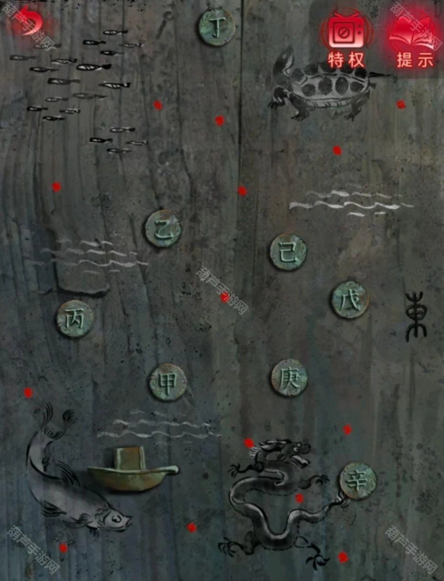 你可以查看一下后方右侧的桌子,海图右边标注着“东”字,这是遵循“上北下南左西右东”的方位规则。把古币和船放置上去后,就能开始进行调整了。首先将船放在左下角大鱼右侧的红点处,接着按照方向依次摆放古币。不过到“丁”这个位置时,可选的点位实在太多了。这时候就要参考一下之前以为没什么用的祭祀口诀,仔细看会发现里面有重复的“公事”字样——乙丙、己庚、庚辛之间都提到了“公事”,或许这三组对应的距离是相同的?那不妨先把除了“丁”之外的古币都摆放好,最后再上下调整“丁”的位置,应该就能完成了。