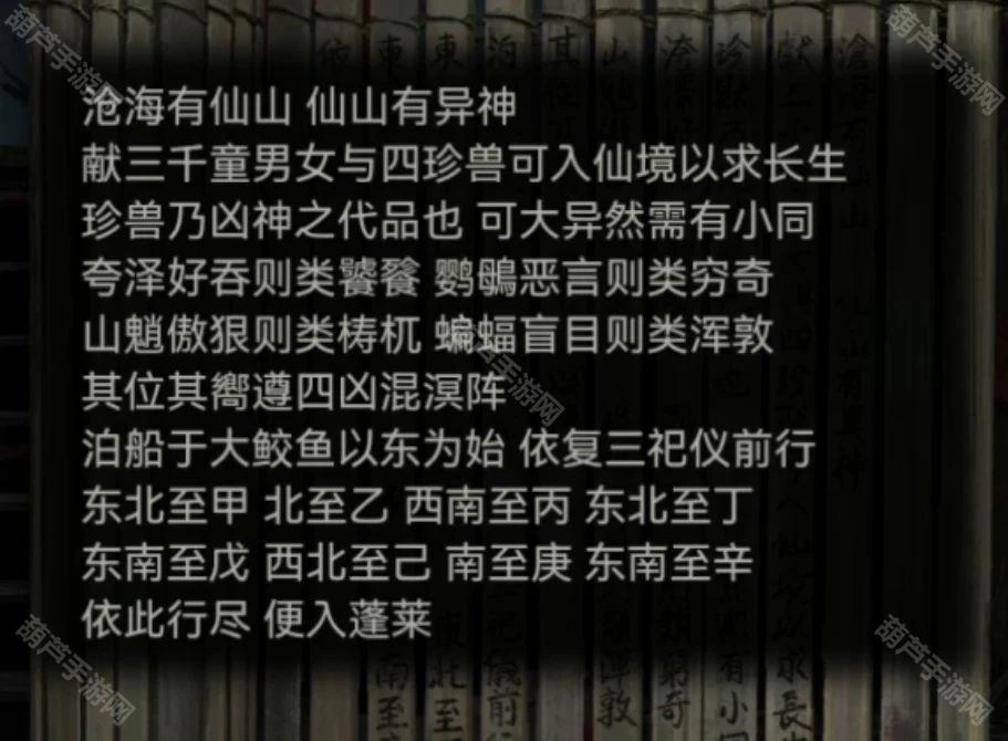 上船后查看一下,左下角拿到蝙蝠木雕,左边的桌子写着四个方向,右边的桌子是一张海图,上面有个断掉的桅杆,左边地上的书简是线索,重点有两个,一个是夸泽-饕餮,鹦鹉=穷奇,山魈=梼杌,蝙蝠=混沌,第二个是船从大鲛鱼东边开始,东北到甲,北到乙,西南到丙,东北到丁,东南到戊,西北到己,南到庚,东南到辛就能进入蓬莱了。