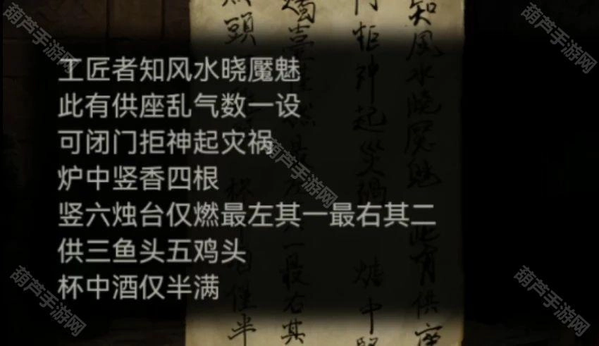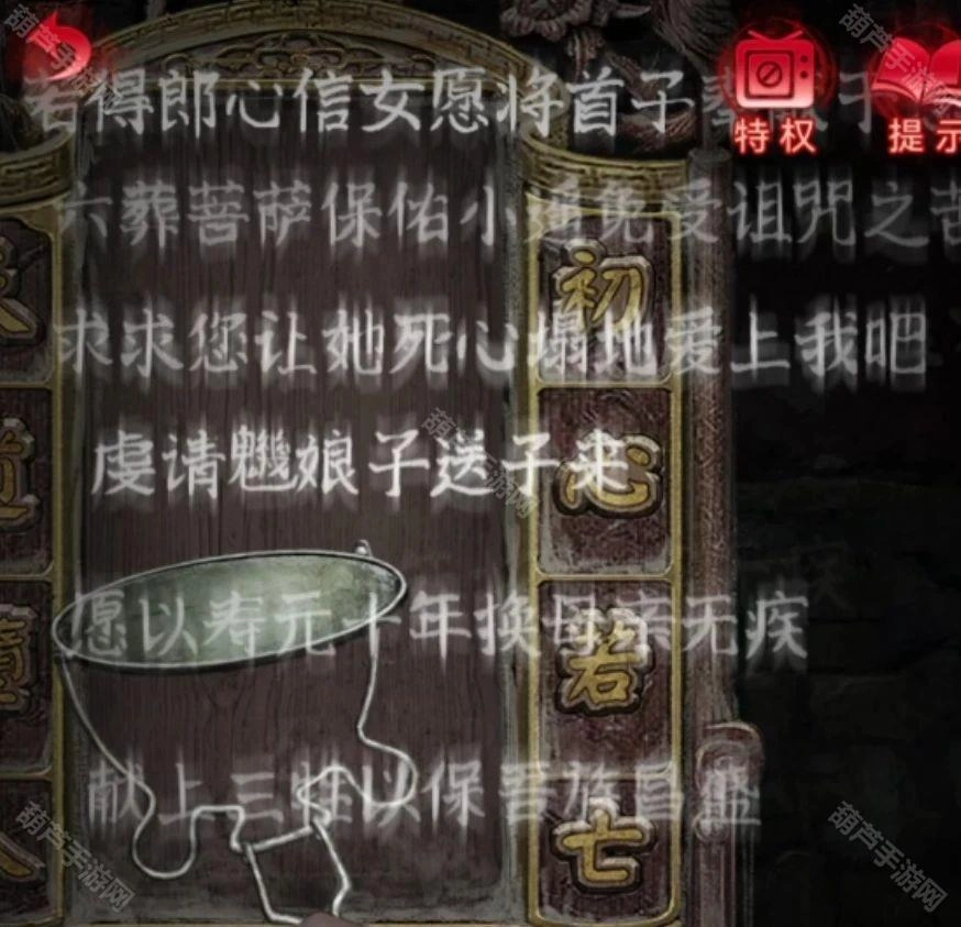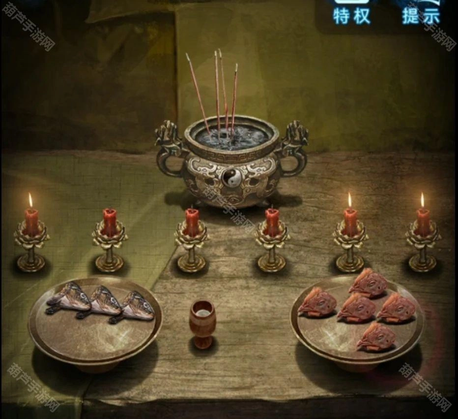 回到最开始的地方查看,把心形雕塑扔进水柱交给肖医生,切换角色来到密室对秤使用心形木雕获得纸元宝,愿力道具+1,再查看一下左下角的小纸条,就是供桌的摆放了,记下来香4鱼3鸡5,酒杯半满,烛台左1右2中间空。记好后别忘了拿走中间的山魈木雕和左下角绳子。