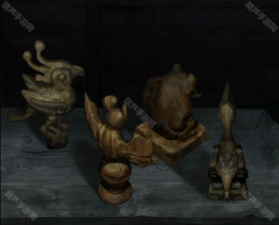 现将四个木雕都放置在左侧桌子上,东西南北四个方位对应木雕的位置。此前已确定:饕餮(特征为大肚子、大嘴)坐北朝西南,穷奇(特征为兽面有翅)坐南朝西北,梼杌(特征为人面巨牙)坐西朝西,混沌(特征为有翅无目)坐东朝西。结合“汚泽对应饕餮、鹦鹉对应穷奇、山魈对应梼杌、蝙蝠对应混沌”的关联,可推导出:鹈鹕坐北朝西南,鹦鹉坐南朝西北,山魈坐西朝西,蝙蝠坐东朝西。按照此调整后(如图所示),即可获得一个丹药瓶,同时上方的桅杆也会修复完成,最后需记得取走鹈鹕木雕。