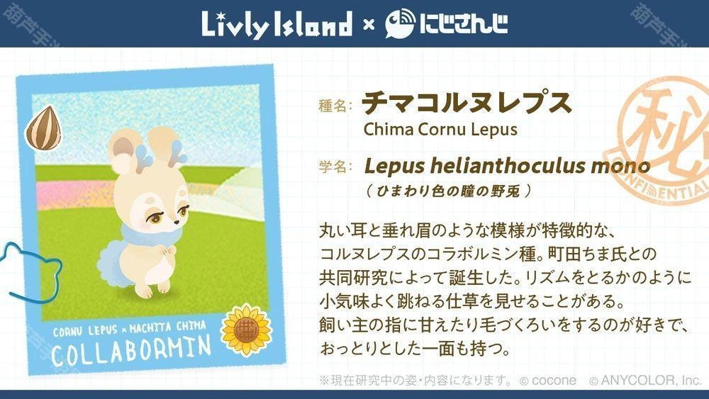 官方表示,在此次《宠物岛LivlyIsland》与「NIJISANJI」的联名合作中,平日里就十分热衷于照料Livly的三位主播——戌亥とこ、町田ちま、壱百満天原サロメ,将以「虚拟研究员」的身份,为大家筹备各类企划活动。