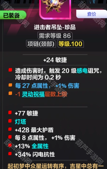 随机词缀:魔灵之源效果,暴击伤害,暴击值,闪电技能暴击伤害。