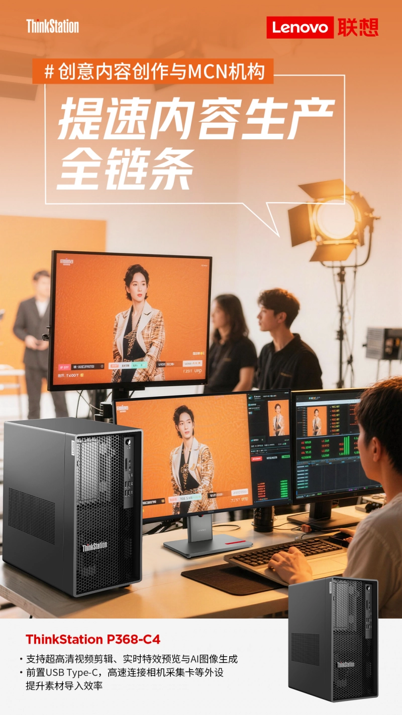 针对短视频/MCN创作团队、直播工作室以及平面/UI设计师这类群体,ThinkStation P368这款创意工作站,正助力他们加快内容生产与创意转化的速度。该设备配备了GeForce RTX5060/5060Ti显卡,能够高效支持4K和8K超高清视频剪辑、复杂特效实时预览、AI图像生成等核心工作任务,帮助创意迅速转化为直观的视觉作品。
