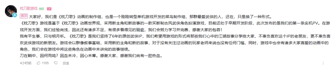 发布预告之后,《枕刀歌》官方也在评论区留言,说自己是刚转型做单机游戏开发的新手制作组。