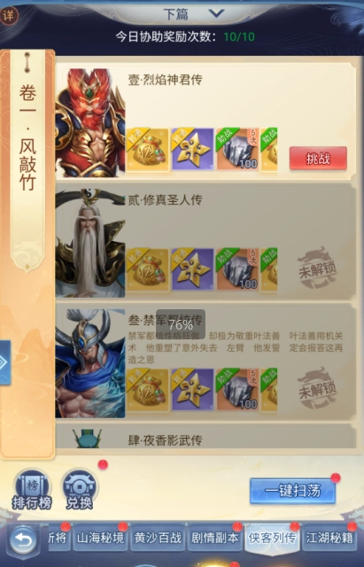 这两个活动只要通关,就能用不值钱的铜钱买到大量好物,几乎跟白送没区别。能打通就尽量打通,侠客列传这块,可以找区里的大佬带一带,只要过一次就可以了。
