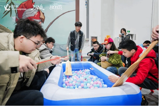 不仅如此,现场还设有包含“官渡酒馆”“阿超钓鱼”“过关斩将”等在内的小游戏区域。这些小游戏形式多样:有的是对线上游戏内场景的还原;有的需要玩家快速用道具装扮自己,由另一人猜测其COS的武将身份;有的则要求玩家拿起钓竿钓起玩具小鱼,凭借“渔获”兑换奖励;还有一些是在《三国杀》原有玩法规则基础上进行的创新,十分考验玩家对新玩法的适应能力和随机应变的能力……