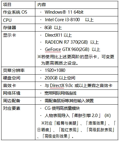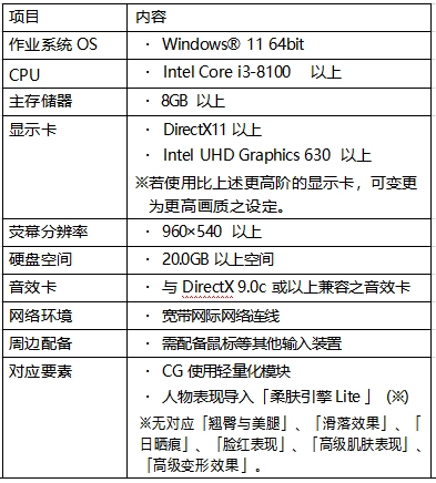 ※必要存储器容量、硬盘空间、VRAM 容量,视所使用的系统环境有所不同,请特别留意。